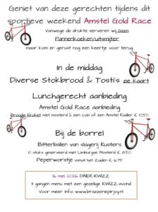 Met de Zaterdag de tourversie die ook door het mooie Scheulder komt, Wij zorgen dat het ook op zaterdag een feest en lekker eten in de Middag en in Avond, In de Middag hebben wij een aangepaste Amstel Gold Race menu kaart voor jullie, voor in de Avond onze heerlijk avond gerechten.