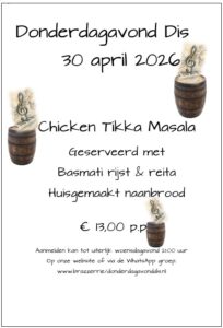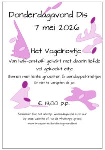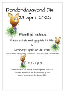 π aanmelden voor een tafel bij Donderdagavond Dis kan tot uiterlijk woensdagavond 21 uur.